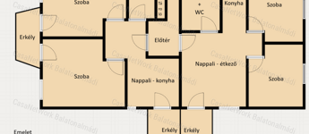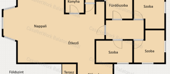- földszint: tágas nappali-étkező, konyha, előszoba, három hálószoba, fürdőszoba, toalett és terasz