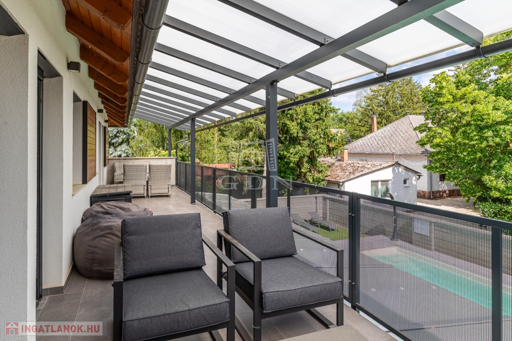 A telken kialakításra került egy 8x4 méteres távvezérléssel is fűthető, fedett, esti megvilágítással rendelkező medence, melyet térkövezett napozóterasz vesz körbe.