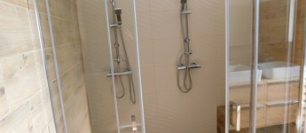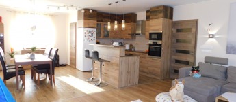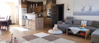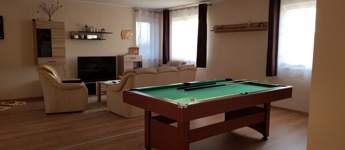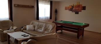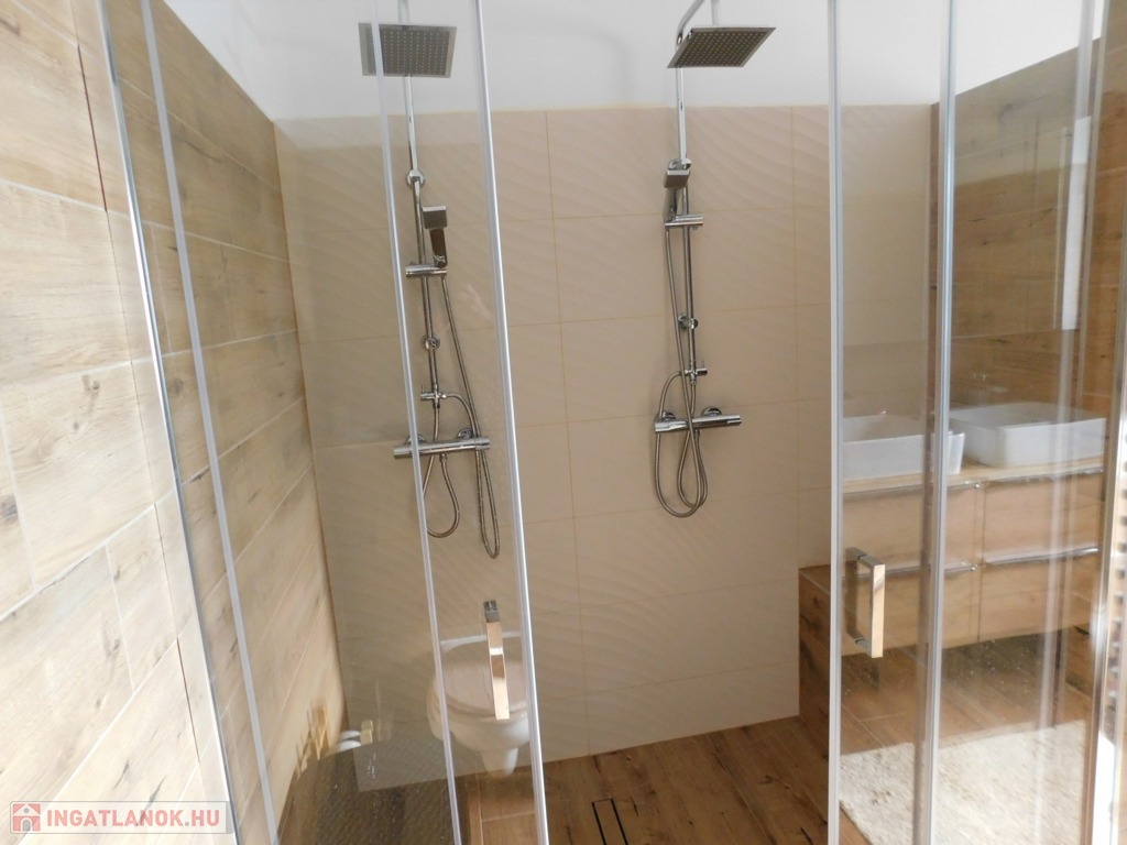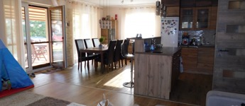 Az egyik lakrész 225m2, melynek földszintjén található 50m2-es teraszkapcsolatos amerikai konyhás étkező-nappali, ahol nagyobb család vagy baráti társaság kényelmesen elfér a terített asztalnál. Továbbá 1 hálószoba hozzá kapcsolódó tágas fürdőszoba sarokkáddal és kétszemélyes zuhanyzóval, külön nyíló 2 szoba, gardrób, fürdő-wc, háztartási helység, tároló, kamra, közlekedő, előtér, lépcsőház. Az emeleten nappali, külön nyíló 2 szoba, fürdőszoba sarokkáddal, gardrób, közlekedő került kialakításra.
