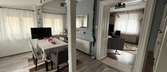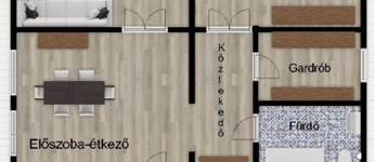 A nagyobb 90 m2-es házban három szoba (hűtő-fűtő klímával felszerelt) , előszoba-étkező, konyha, közlekedő és gardrób helyiség került kialaításra. Két fürdőszoba szolgálja a lakók kényelmét – az egyik zuhanyzós, a másik kádas –mindkettő felújított. Minden helyiség modern burkolatot kapott.