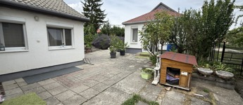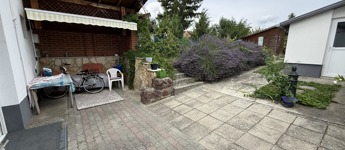 Az udvar minden szempontból jól átgondolt: térkövezett, rendezett, akár autó számára is biztosít parkolást. Egy 25 m²-es, fedett kiülő teremt kellemes, árnyékos pihenőhelyet, emellett fa tároló gondoskodik a kerti szerszámok és kerékpárok elhelyezéséről, valamint a ház alatt egy 12 m2-es pince is megtalálható.