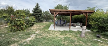 A gondosan karbantartott kertben gyümölcsfák – többek között alma, meggy, sárgabarack és őszibarack – biztosítják a friss termést, míg a veteményes és magaságyás a saját termesztés örömét kínálja.