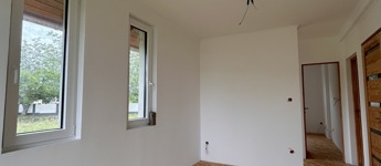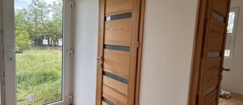 - 3 rétegű Gealan külső nyílászárókkal ellátva, belül natúr fa fenyő ajtók festés nélkül.