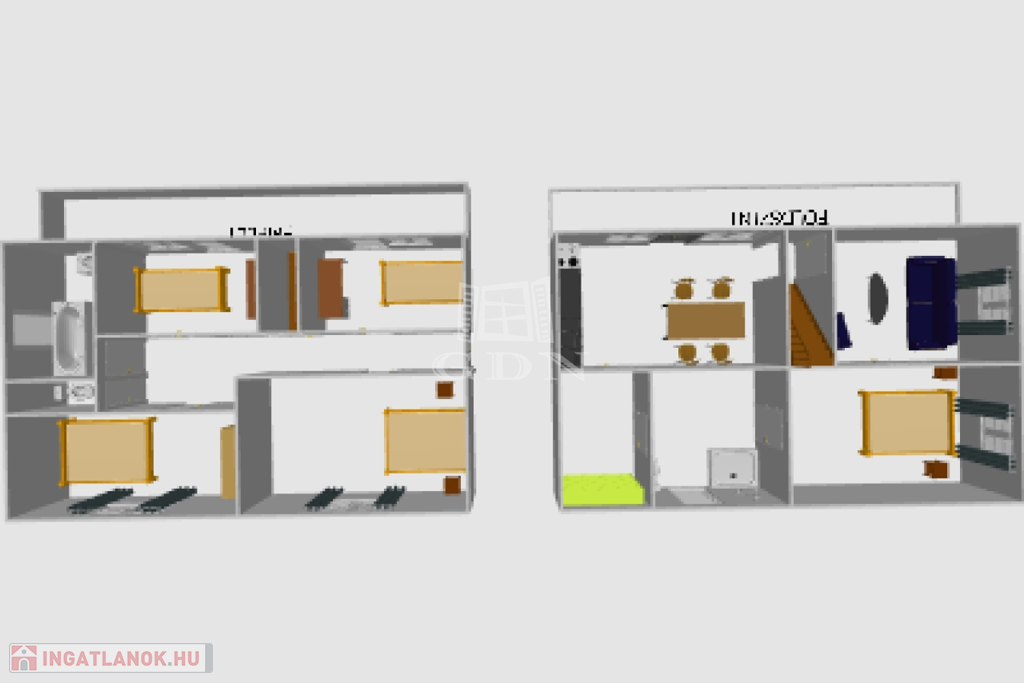 A 60 négyzetméteres alsó szinten 2 szoba, konyha, fürdőszoba, WC, kamra található. A 67 négyzetméteres felső szinten, 4 szoba fürdőszoba, külön WC, valamint napfényes 8 négyzetméteres terasz található, amelyről gyönyörű kilátás nyílik a kertre és a községre!
