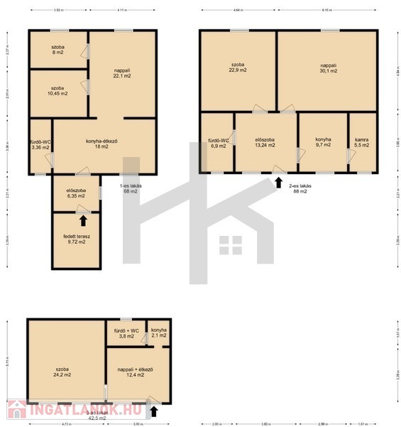 - 88 m2-es, melyben két külön nyíló hálószoba, nappali-étkező, fürdőszoba-wc, konyha és kamra található.