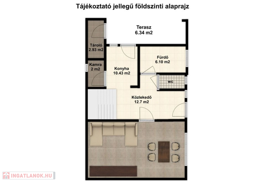 A földszinten kertkapcsolatos teraszról érkezünk a konyhába, a közlekedőről juthatunk a nagy nappaliba, innen érhető el a fürdő és külön wc.