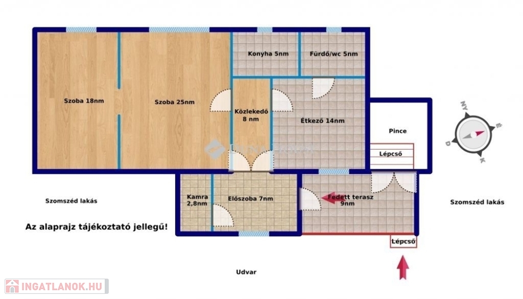 Ez a világos, tágas, 2 szobás lakás külön étkezővel is rendelkezik így praktikus a belső tér minden tekintetben.A szobákat és a közlekedőt parkettákkal látták el, míg a konyha, fürdő/WC, kamra, előtér és a fedett, nyitott terasz praktikusan hidegburkolatot kapott.