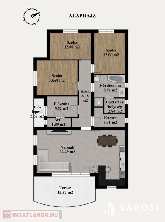 A ház három hálószobával, valamint egy tágas, amerikai konyhás nappalival rendelkezik, így kiválóan alkalmas családosok számára is.
