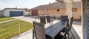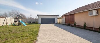 Az elektromos garázskapuval felszerelt, 35 m²-es dupla garázsban kényelmesen elfér két autó is, az udvar nagy része Frühwald térburkolattal burkolt, de maradt hely a kerti játszótérnek, illetve zöldfelületnek is.