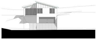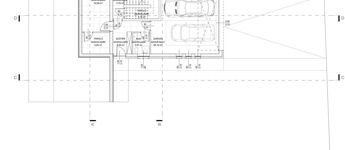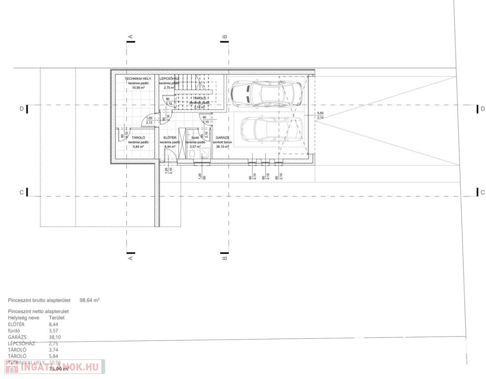 Alsó szinten kialakításra került, egy 38 m²-es dupla garázs, előtér, fürdő, két tároló, valamint a hőszivattyús fűtési és meleg víz ellátást biztosító gépészeti helyiség.
