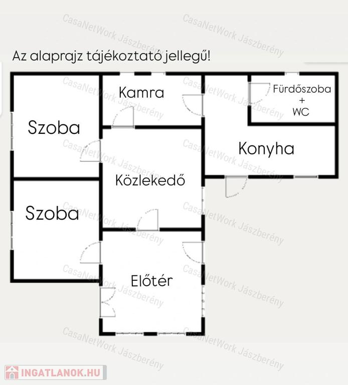 - Helyiségek: előtér, közlekedő, 2 szoba, fürdőszoba + WC, konyha, kamra