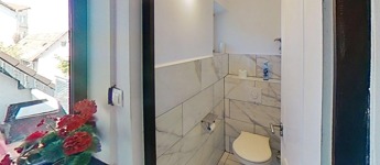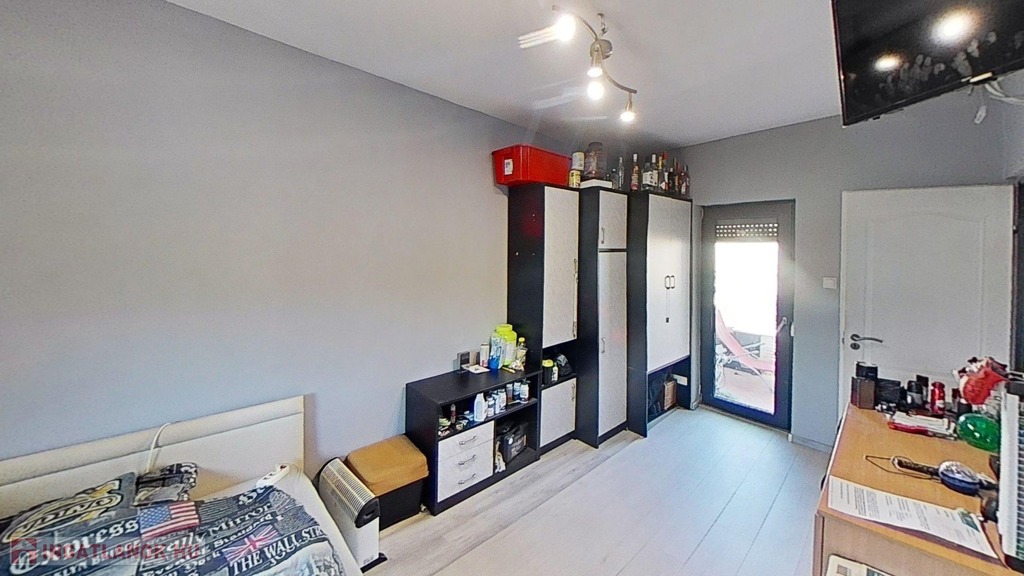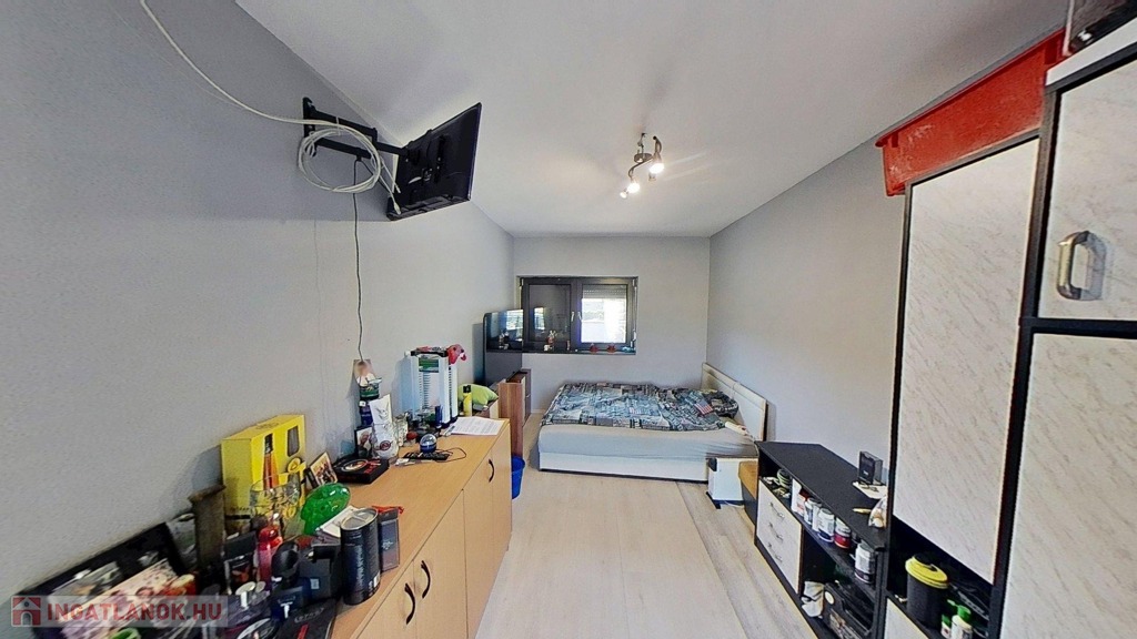 A földszinten további - saját fürdőszobás - hálószoba, utcafronti bejárattal is rendelkező iroda, félszoba, és egy wc/kézmosó is található.