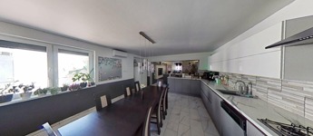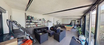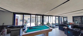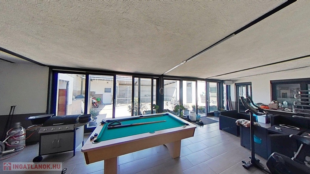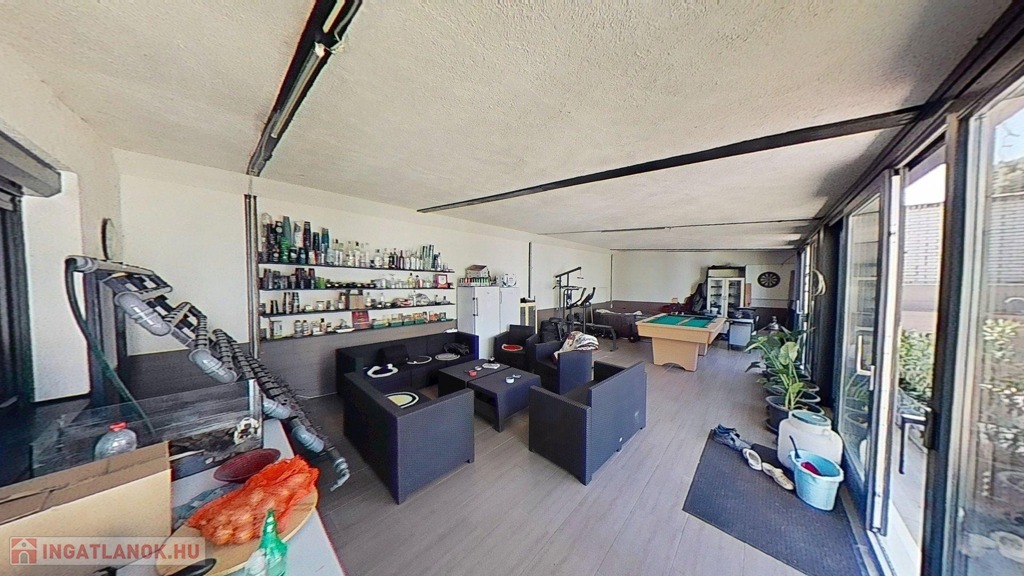 A 374 nm-es ház alsó szintjén a családi élet központja a hatalmas, egy légterű nappali és konyha, mely mégis kellően elszeparált egymástól. A konyhából nyílik a “programtér”, ahol jelenleg kondi, biliárdasztal, jakuzzi, és a bulik kellékei találhatóak. Akár innen is kiléphetünk a teljesen kövezett, zárt udvarra, ahol nagy kutyakennel, wc és melléképületek is találhatóak.