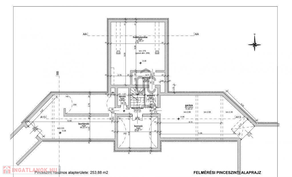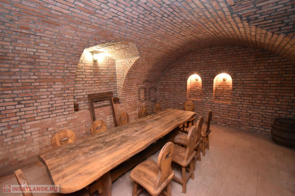 A pinceszinten több autónak garázs nyújt parkolási lehetőséget. Ezen a szinten még kazánház, közlekedő, borospince, tároló, hobbyszoba kerültek kialakításra.