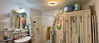 -A fürdőszobában a fürdőkád helye ki van építve, de jelenleg épített zuhanyzó van.