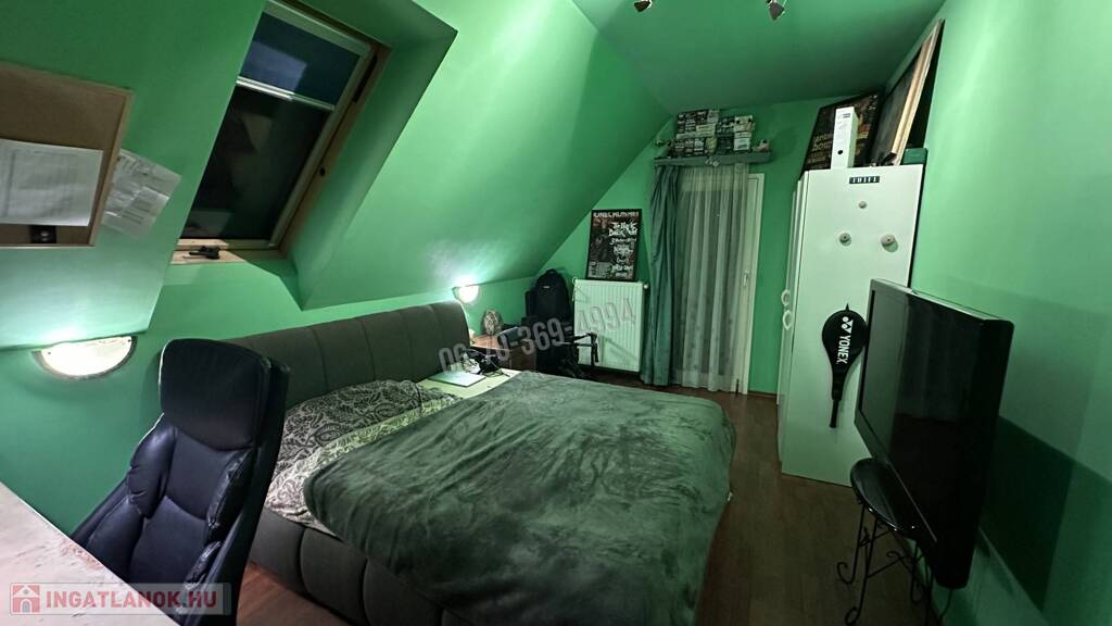 A tetőtéri szinten pedig, szintén 3 külön nyíló szoba, fürdőszoba +WC, tároló, gardrób és közlekedő, és egy erkély található.