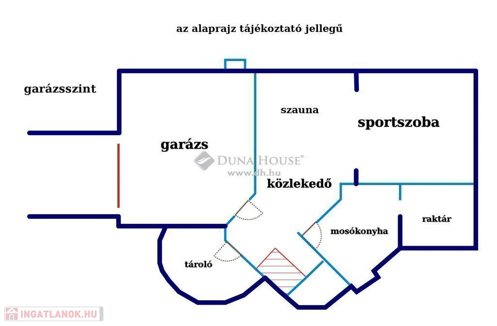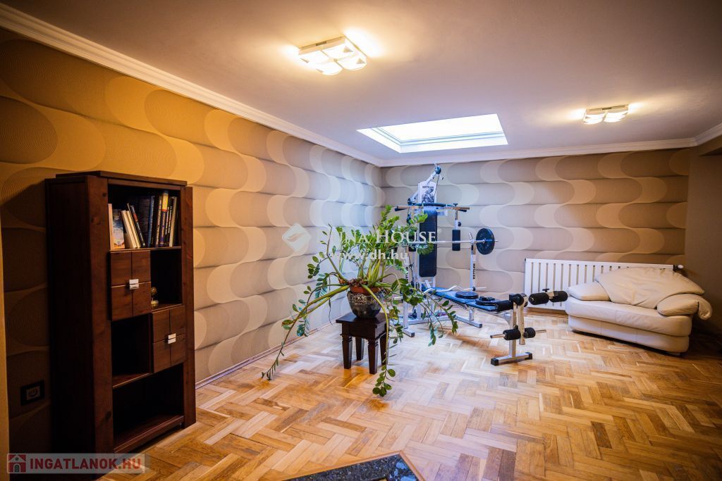 Garázsszinten két állásos garázs, több tárolóhelyiség, fürdő WC-vel, háztartási helyiség, sportszoba, szauna.