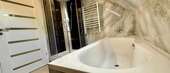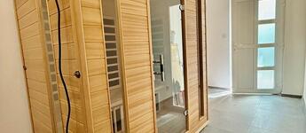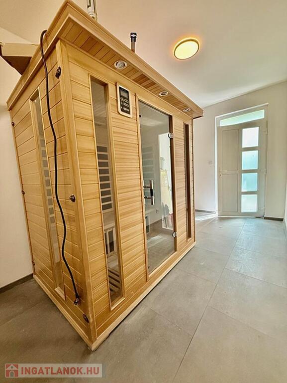 Tartozik a házhoz fedett kocsibeálló, Jacuzzi és kombinált finn szauna, valamint a napelemes rendszer és elektromos autó töltő rendszer előkészítése is megtörtént.
