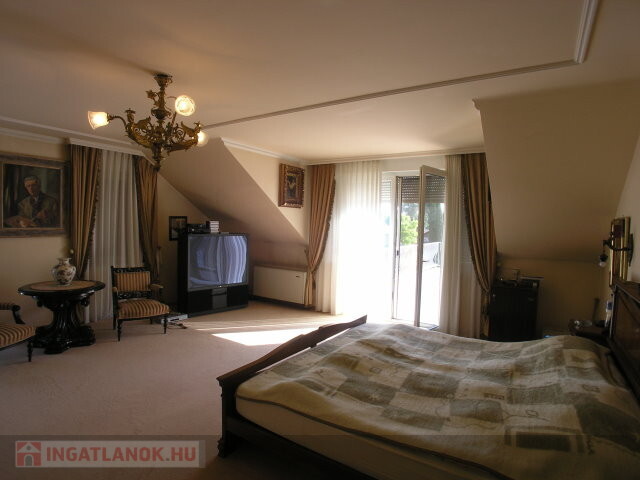* emelet: nyugati szárny: 3 szoba, fürdőszoba, WC. Keleti szárny: mesterháló nagy fürdőszobával és gardróbbal, 3 szoba, fürdőszoba, 2 erkély. A garázs felett személyzeti lakás.