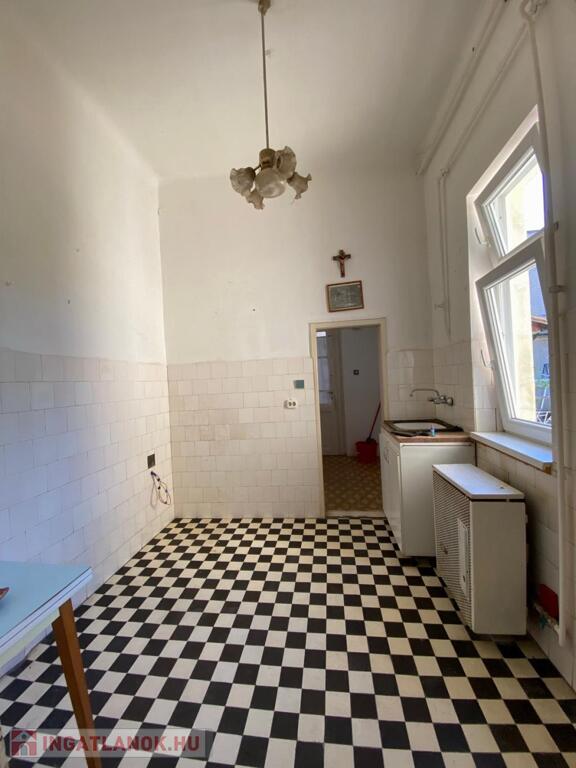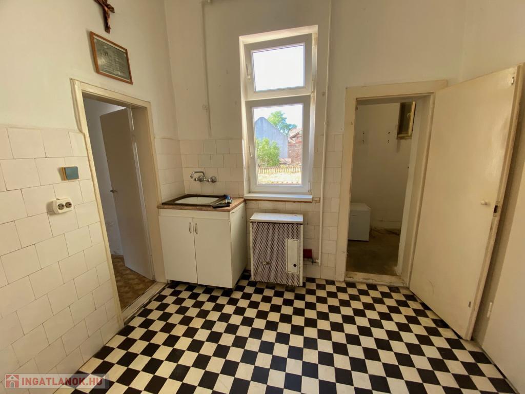 A konyha kertre, illetve belső udvarra néz, praktikus kamrával, mely lebontható, mert látott már szebb napokat.
