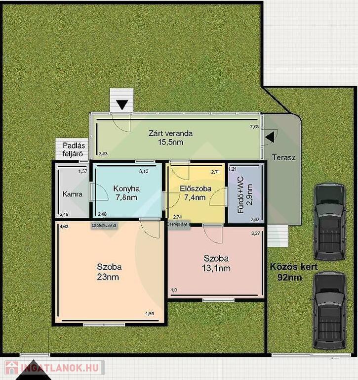 Külön is megvásárolható, az I. rész 329nm-es telken fekvő, 66nm-es 2 szobás felújított, szigetelt családi ház, (tulajdoni lapon lakás) 15,5nm-es verandával, a II. rész 264nm-es telken fekvő, tulajdoni lapon 67nm-es, befejezetlen tégla ház (tulajdon lapon lakás). A telek használati megosztását tekintve, a szomszéddal még egy közös 92nm-es kert rész is tartozik a házhoz, ahol két autó beállási lehetősége adott.