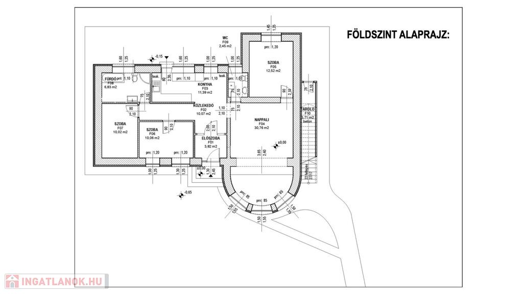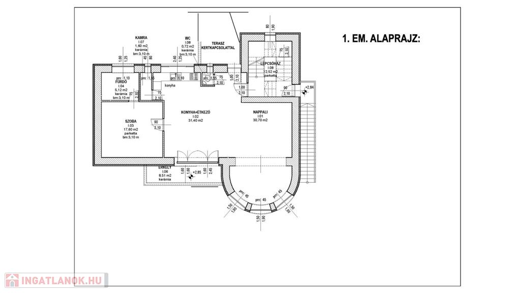 Földszint 98 négyzetméter, nappali, konyha, 3 szoba, fürdő és külön vendég mosdó, valamint egy közvetlen kertkapcsolatos terasz kapott helyet.