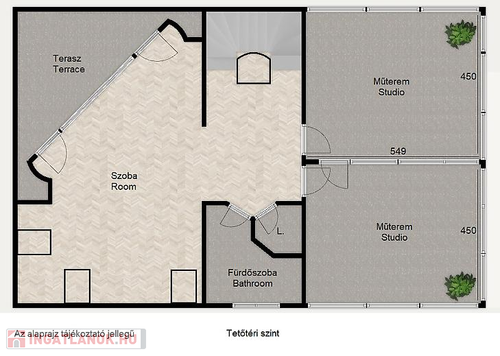 Ugyanezen szinten két, egyenként 25-25 nm-es, üvegszerkezetű műterem is kialakításra került. Ideális környezet az alkotásra vagy a növények kedvelőinek.