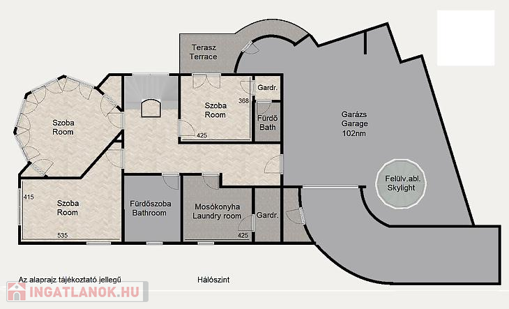 A gépjárművek tárolását egy 102 nm-es, felülvilágító ablakkal is szerelt garázs biztosítja.