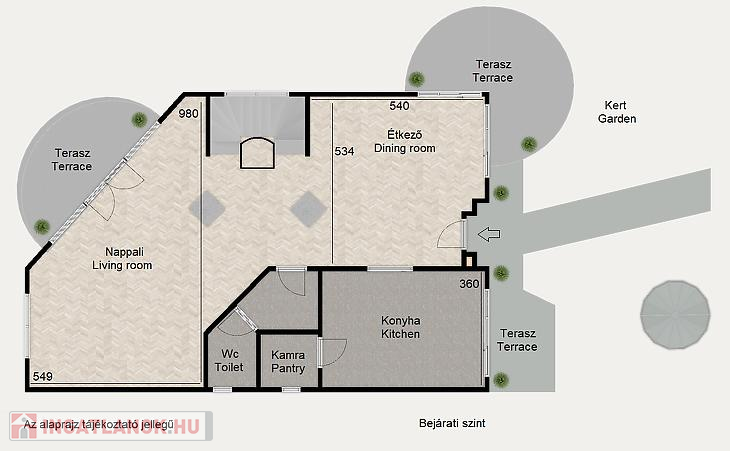 Az épület bejárati szintjén a közös terek kerültek kialakításra. Egy tágas, teraszkapcsolatos, panorámás nappali, egy 30 nm-es étkező terasszal, egy 20 nm-es, szeparált, ugyancsak teraszkapcsolatos konyha kamrával és egy külön wc.