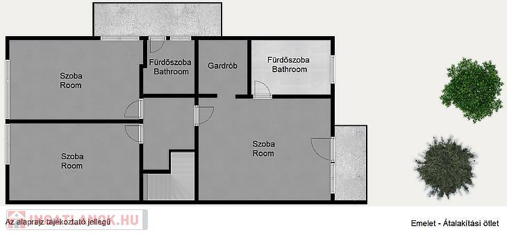 Az emeleti szinten kialakításra került egy keleti fekvésű, utcai nézetű, szép kilátással rendelkező, tágas szoba, egy hátsó kertre néző, nyugati fekvésű, erkélykapcsolatos szoba, egy erkéllyel rendelkező, benapozott közlekedő és egy kényelmes méretű fürdőszoba. Igény szerint a szinten kialakítható 3 szeparált háló és 2 fürdőszoba is.