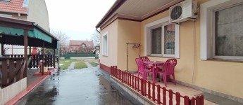Az udvarba a biztonságos bejárati kapun keresztül jutunk, ami méretéből adódóan gépkocsi behajtására vagy akár is alkalmas. Belépve a kapun jobbra találjuk a két szintes családi házat, balra pedig a külön bejáratú üzlethelyiséget. A bejárati ajtó egy 10 nm-es fedett teraszról nyílik, ahol reggelente kávézhatunk, esténként pihenhetünk, innen az előtérbe érkezünk, ahonnan az egy légtérben, de mégis kissé elválasztva a tágas 28 nm-es járólappal burkolt világos nappali nyílik. Ez a ház központi része, itt ez egy közös tér ahol összejöhet a család, kellemes időtöltésre. Jobbra helyezkednek el az utcára néző, de mégis csendes egymás mellett nyíló 16,5 nm-es, járólappal burkolt, hangszigetelt fa ablakokkal ellátott szobák, amik saját életteret is nyújtanak a család tagjainak. Balra találjuk a harmadik, 13,5 nm-es fa parkettás tágas, világos szobát, ebből a szobából a teraszra nyílik a kilátás. A szoba mögött jobb oldalon egy folyosó vezet, aminek a végén jobbra nyílik a 3,5 nm-es csempével burkolt, sarokkádas, ablakos fürdőszoba. Mellette kapott helyet 1,5 nm-es kerámia burkolatú toalett. Szemben a 7,5 nm-es tágas gépesített, bútorozott, étkezős, ablakos, világos konyhába jutunk. A konyhából nyílnak a tárolók és innen egy ajtón keresztül juthatunk az udvar aszfaltozott kocsibejáró részére.