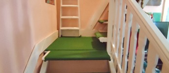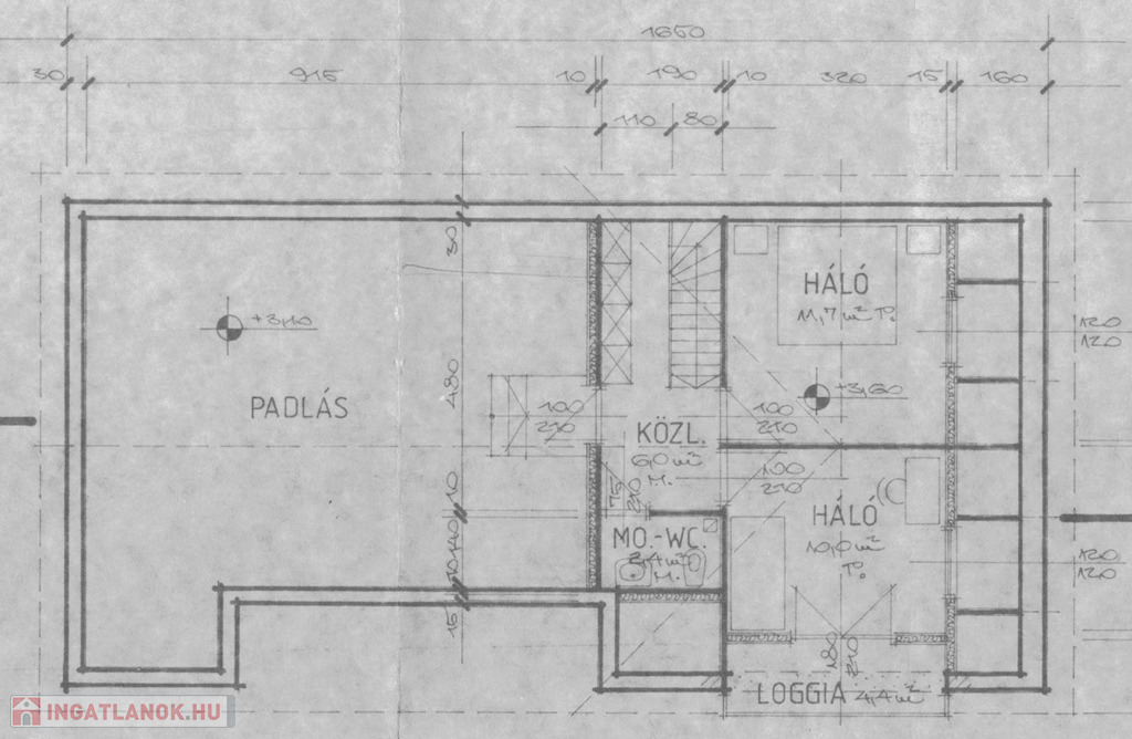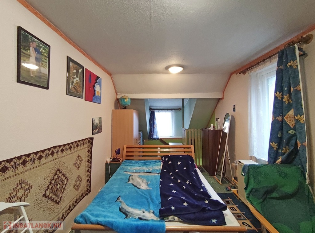 Az emeletre a nappaliból, a pillangó lépcsőn jutunk fel, balra fordulva a 11,7 nm-es járólapos hálószoba nyílik, ebből a szobából nyílik a másik, 10 nm-es járólapos hálószoba, innen egy 2,4 nm-es kádas, ablakos fürdőszobába jutunk.