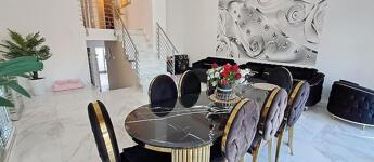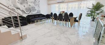 A földszinti (84,5 m2) és a félemelet (35 m2) részben 3 szoba, konyha, hall, gardrób szoba, közlekedő, fürdőszoba és mellékhelyiség és terasz került kialakításra.