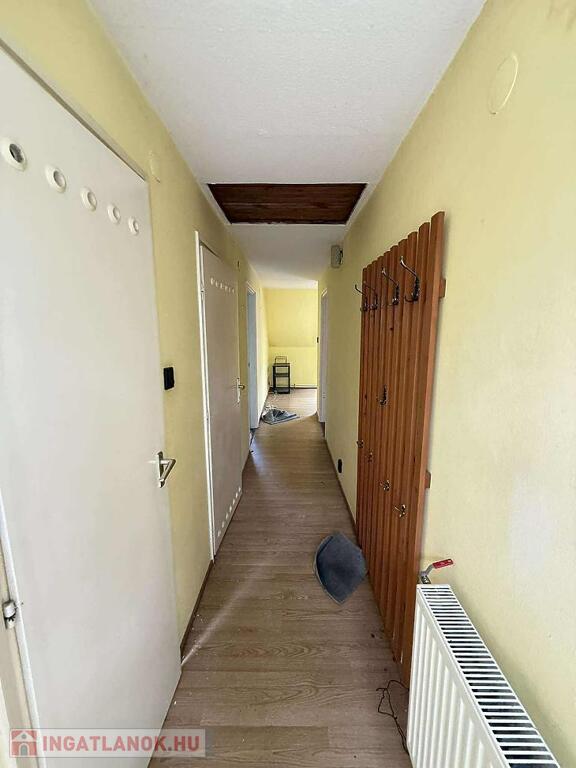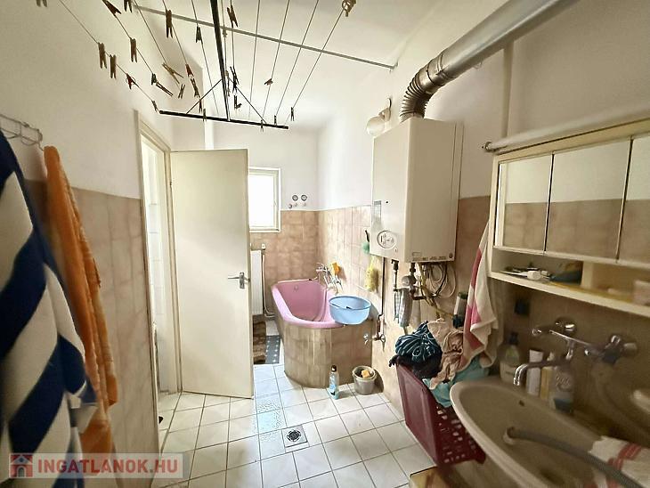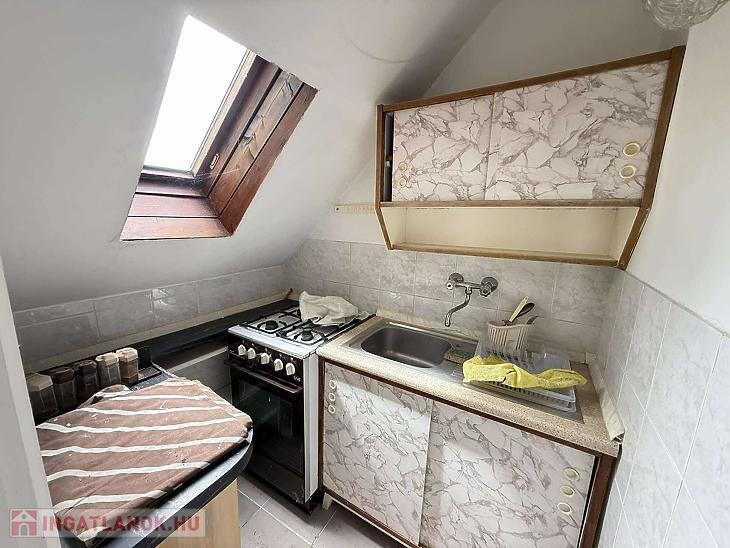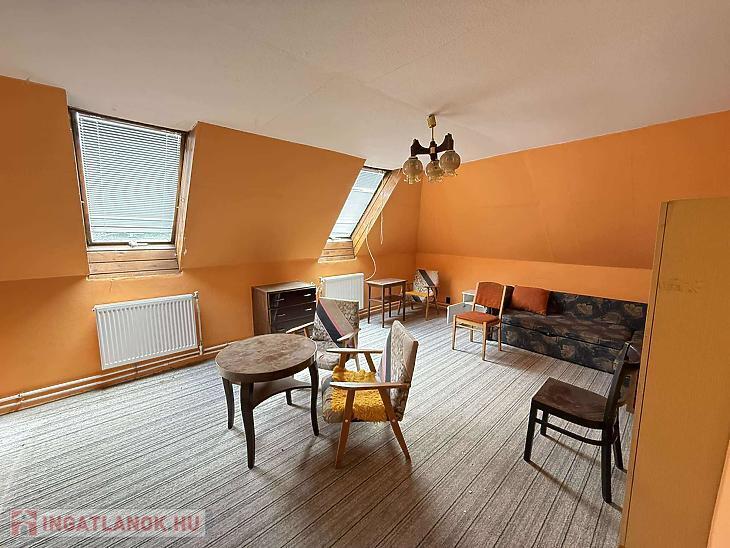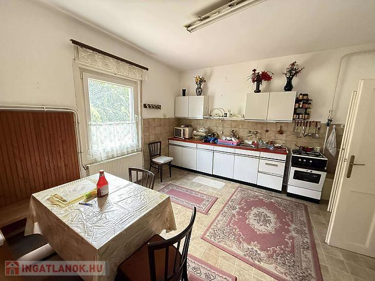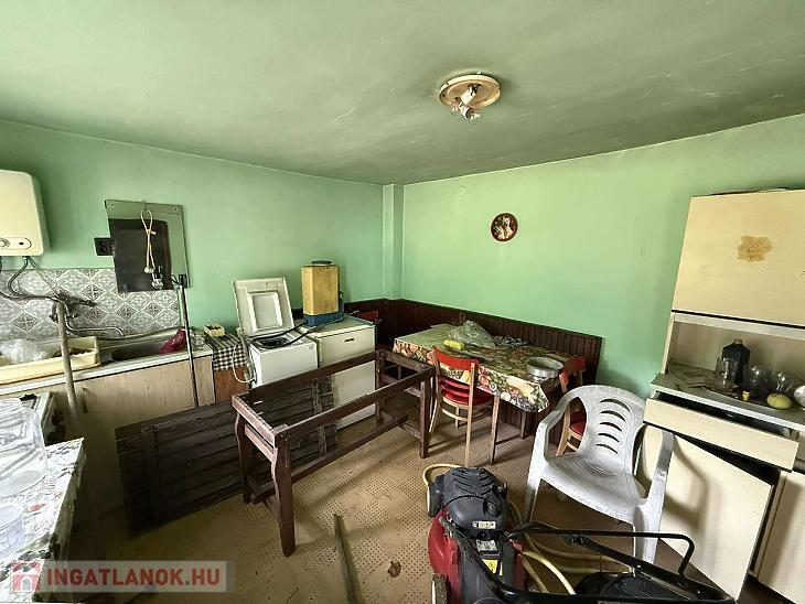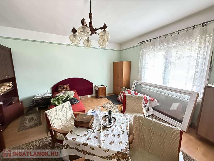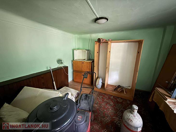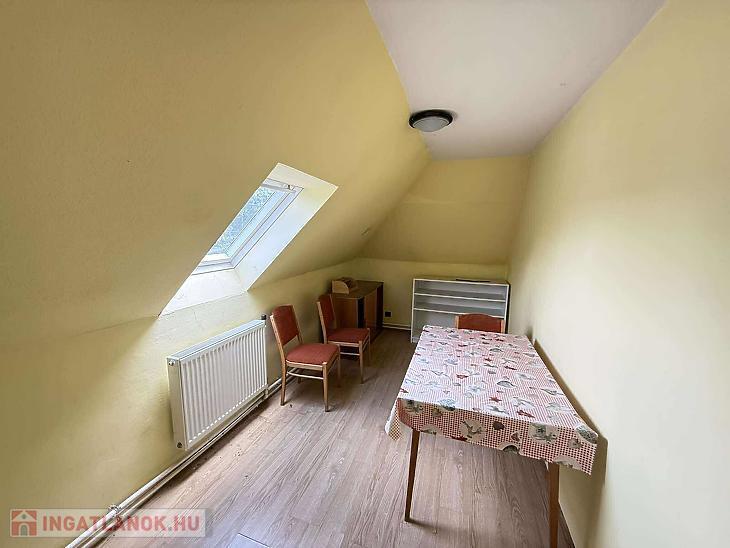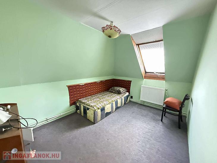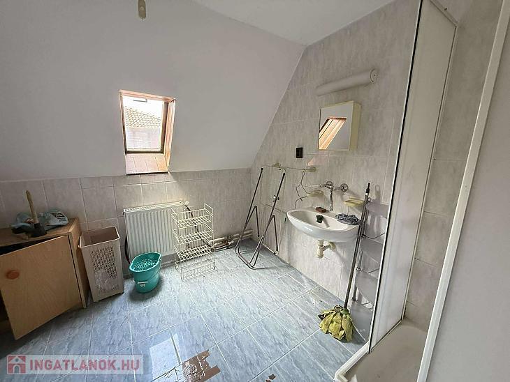 Az földszinten található előszoba, 25nm szoba, nagy étkezős konyha, fürdőszoba külön mellékhelyiséggel, illetve egy kamra. A tetőtéri lakrész külső lépcsőn közelíthető meg ahol közlekedő, 3 szoba, konyha, illetve egy fürdőszoba mellékhelyiséggel lett kialakítva. A szobák laminált parkettával burkolt a fürdőszobában járólap található. A fűtést kombi cirkó biztosítja. A földszinten a nyílászárók ki lettek cserélve alumíniumra, a tetőtérben fából vannak. A villanyvezetékek alumíniumból vannak. A telken belül található még egy 20nm-es melléképület, ami szoba, konyha, valamint egy 120nm-es műhely is található szerelőaknával.