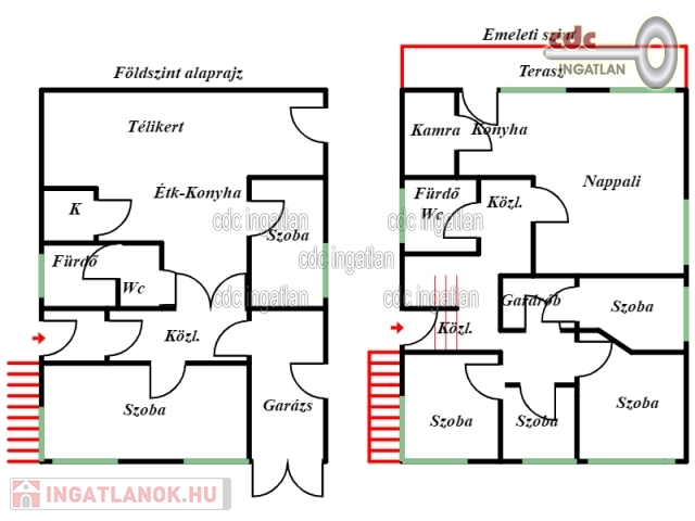 Akár több generáció összeköltözésére is alkalmas lehet, de befektetésnek is kiváló a két külön kialakított lakrész miatt. Elhelyezkedését nézve pedig vállalkozásnak is tökéletes helyszínt nyújthat. Az ingatlan 824 m2-en helyezkedik el, ennek több mint a fele a szabad zöld terület. A 215 m2 alapterületű, kétszintes családi ház szintenként ketté van választva, két külön bejáratú, 107 m2 lakásra, de igény esetén egybe is nyitható. Mindkét lakás külön gáz és villanyórával rendelkezik, így a költségek könnyedén szétválaszthatóak. Az ingatlan magába foglal összesen 5 hálószobát, 1-1 nappalit és konyhát és mindkét lakásban 1-1 fürdőszobát, külön álló mosdókkal. Két autó beállására alkalmas garázs is található benne. A földszinti lakrészben jelenleg két külön nyíló szoba, konyha, étkező, zuhanyzós fürdőszoba, különálló mellékhelyiség, kamra és egy hangulatos télikert találhatóak. A fűtésről és melegvízről kombicirkó gondoskodik. Az emeleti lakrész külső lépcsőn közelíthető meg. Jelenleg négy szoba, nappali, konyha, zuhanyzós fürdőszoba, külön mellékhelyiség, közlekedő és egy nagyobb méretű lépcsőház galériával kínál kényelmet az itt lakóknak. A konyhából nyílik egy nagyobb méretű emeleti terasz. A fűtésről gázkazán, a melegvízről gázbojler gondoskodik. A 824 m2-es telken egy kinti elkerített terasz is kiépítésre került, mely alatt pince is található, mely kiváló lehetőséget biztosít tárolásra. Az épület teljes mértékben használható állapotú, igény szerint esztétikai felújítást igényel. Nagyon jó infrastruktúrával ellátott környék, buszmegálló 3-5 perc sétára található, közelben Spar, orvosi rendelő, gyógyszertár, több bank, bölcsőde, óvoda, iskola. Az ingatlan tehermentes, azonnal költözhető.
