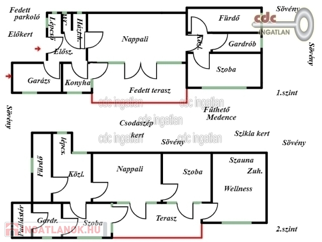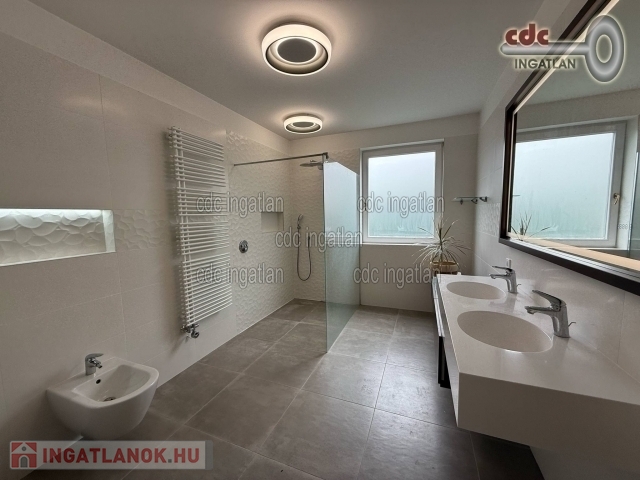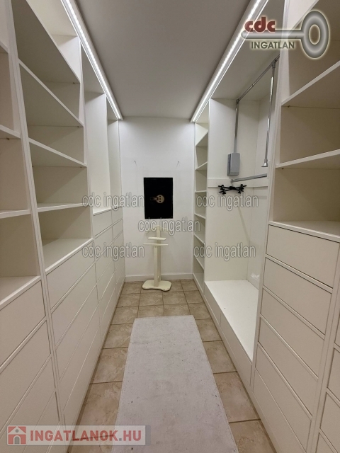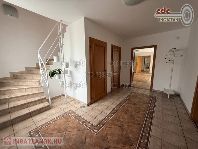 Az előszobába érkezünk, mellette a 35 m2-es, duplagarázs elektromos töltővel és rögtön jobbra a kertkapcsolatos, tágas, nagyon világos, gépesített konyha, egyenesen haladva a 34 m2-es, déli fekvésű, csupa napfényes, 15 m2-es fedett terasszal egybe nyitható, közvetlen kertkapcsolatos nappaliba érkezünk, majd a közlekedőből nyílik a déli fekvésű, nagyon világos, kertre néző szülöi hálószoba, mellette a gardrób szoba és a végén a nagy méretű, ablakos, fő fürdőszoba. A bejárattól balra lehet az emeletre felmenni, ott egy tágas előtérbe érkezünk, rögtön jobbra fürdőszoba, szemben déli fekvésű hálószoba gardróbszobával, terasz kijárattal, nappali és egy déli fekvésű hálószoba, nagy terasz és wellness részleg, szaunával található. A kert csodaszép, parkosított, füvesített, kertésszel karbantartott, örökzöldek, bokrok cserjék, juharfa, fenyőfa, kecskerágó, rózsák, virágzó növények színkavalkádja, sziklakert csobogóval, automata öntözőrendszerrel, ami fúrt kútról működtetett és egy 150 cm mély, 8X4 méteres fűtött medencével. Olyan igényes tulajdonost keresünk akinek fontos, hogy hatalmas, elszeparált varázslatos energiákkal teli, csodálatos kertje és különlegesen praktikus otthona legyen. Ideális családoknak vagy több generáció együtt élésére is kényelmes, minőségi életet biztosít.