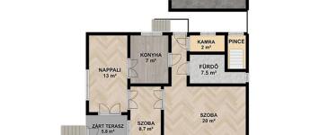 Szobákban parketta, a közlekedőben, nappaliban és a konyhában linóleum, a fürdőben, kamrában és zárt terasznál pedig kő burkolat vannak.
