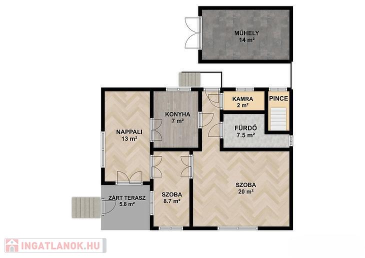 3 szoba, konyha, fürdőszoba + mellékhelyiség, kamra, zárt terasz, műhely.