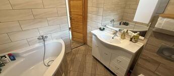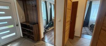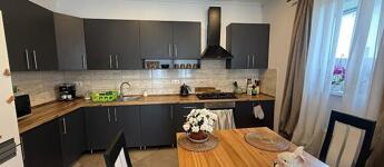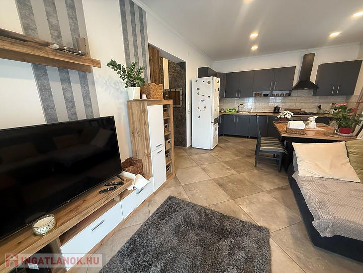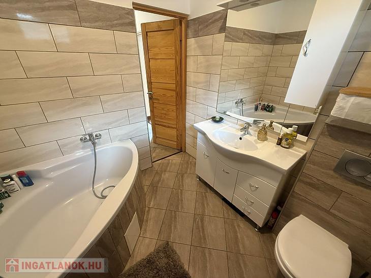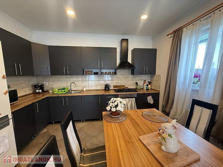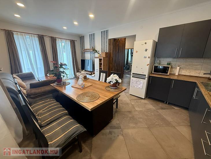 Amerikai konyhás nappali + étkező 10 négyzetméteres teraszkapcsolattal, 3 szoba, kádas fürdőszoba + wc, külön wc, közlekedő, előszoba.
