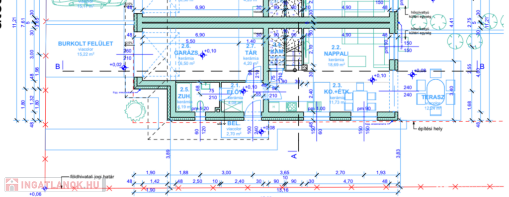 A garázs előtt 5 m előkert került kialakításra, így igény esetén egy további autó felszíni beállása biztosított.