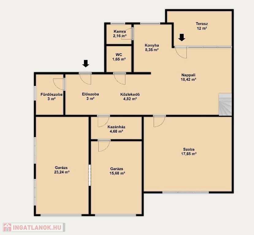 A ház földszintjén továbbá kialakításra került egy közel 40 négyzetméteres, fűtött dupla garázs.