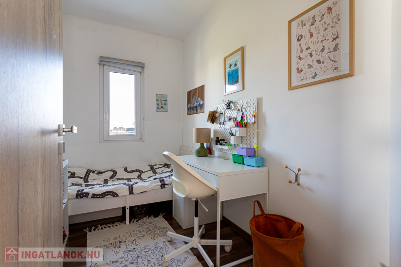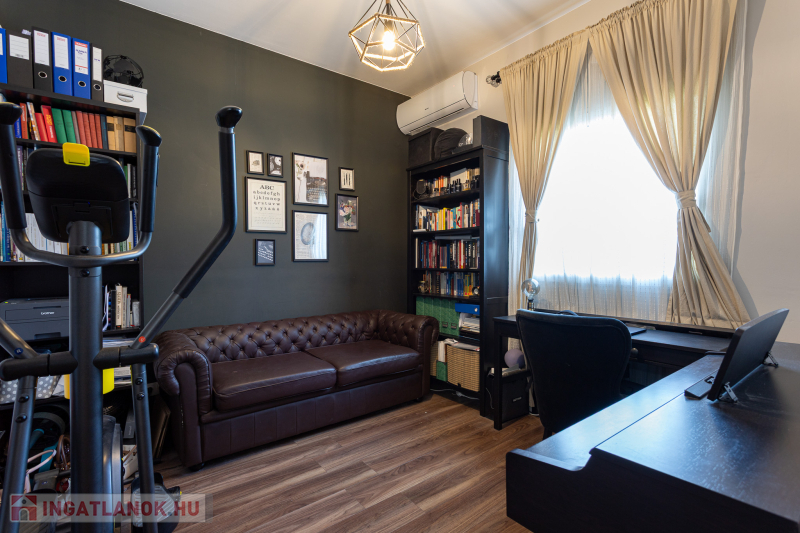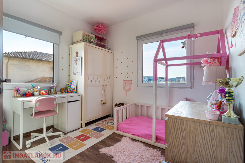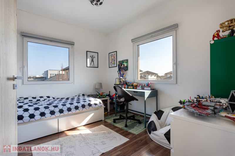 Kizárólag nálunk XVIII. kerület új lakóparkjában almáskertben 2016-ban épült,142m2-es, nappali plusz 5 félszobás, kétszintes, ikerház 2 fürdőszobával,2 WC-vel, fedett terasszal (20m2-es),garázzsal (16m2-es), gépkocsibeállóval, 285m2-es önálló kertrésszel eladó.