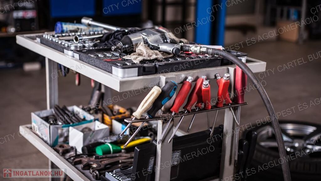 Az utca felől széles elektromos kapu, a műhelybe egy autó beállása lehetséges, de az udvaron legalább 5 autó is elfér. A műhely felől is megközelíthető irodai részben egy kis konyhát, zuhanyzót és WC-t is találunk.