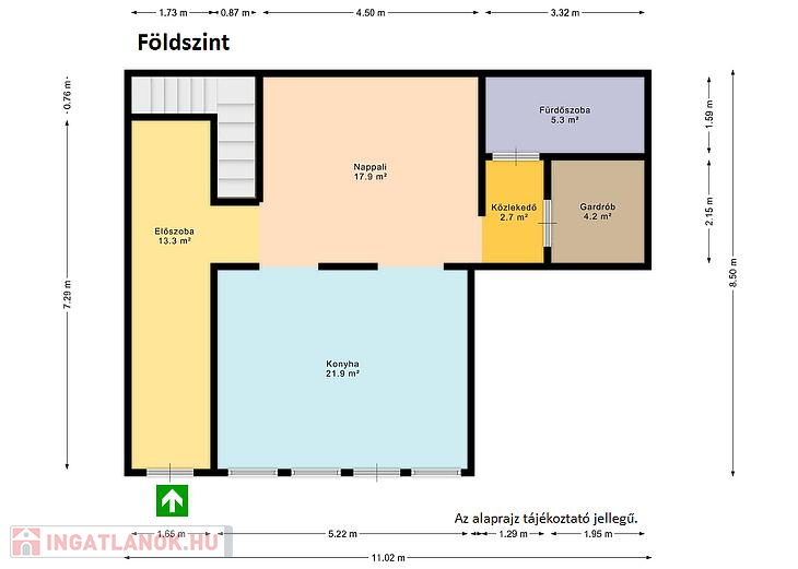 A földszinten nappali, konyha-étkező és egy fürdőszoba WC-vel és egy gardrób, található.