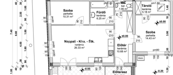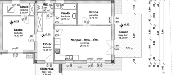 -előszoba(10,68m2), amerikai konyha nappali(26,33m2), 2 szoba(10,31m2, 14,43m2), fürdőszoba(6,25m2), WC(1,9m2), tároló(5,18m2), valamint 15 m2 és 3,89 m2-es terasz.