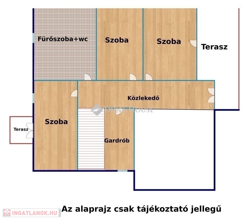 Emelet:Három tágas szoba, amelyek mindegyike kellemes pihenést biztosít. Külön gardróbszoba. Luxus fürdőszoba dupla mosdóval, masszázskáddal. Két terasz, amelyek kellemes kilátást nyújtanak a környékre.