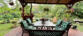 A nappali előtt egy 26 m²-es, rusztikus, 100 éves gerendákból készült fedett terasz, amely egy intim, gondozott kertre és grillezőre nyílik. Konyha előtti 14 m²-es terasz működő kemencével és sparherddel – tökéletes helyszín a kültéri sütés-főzés szerelmeseinek.