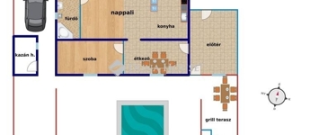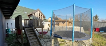 Az épület mögötti kert biztosítja a kikapcsolódást kicsinek és nagynak egyaránt... Van itt fedett terasz épített grillsarokkal (20 m2), gyermek játszótér, kerti medence és egy jókora tároló melléképület (40 m2). A telek 798 m2.