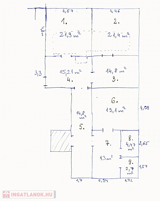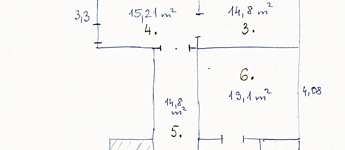 A többi helyiség nagyobb felújítást igényel( 1., 2., 3., 4., számokkal jelölt helyiségek). Ezekben(3 szoba, előszoba) nincs fűtés, ezért CSOK+ és Otthon Start Lakáshitel igénybevétele nem lehetséges.