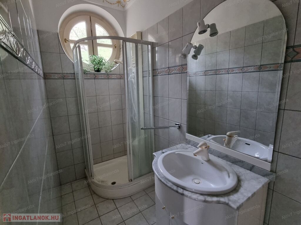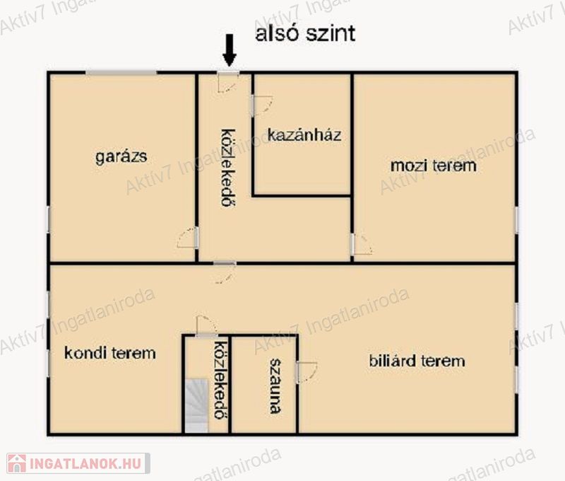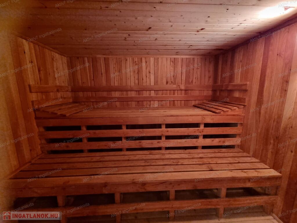 Az alsó szinten egy elektromos kapuval ellátott garázs, a 28 férőhelyes mozi terem, szauna, biliárd szoba , kondi terem ( ami jó helye lehet egy jakuzzi elhelyezésének is), és a kazánház található. Nem elhanyagolható  tényező az ingatlanhoz tartozó kertrész sem!